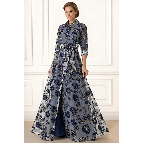 Linea ad A Lunghezza al pavimento Abito Camicia Abito da invitata a nozze Abito Formale Abito da cerimonia per signora Manica 3/4 Colletto a Camicia Elegante Semplice Formale Organza Jacquard con