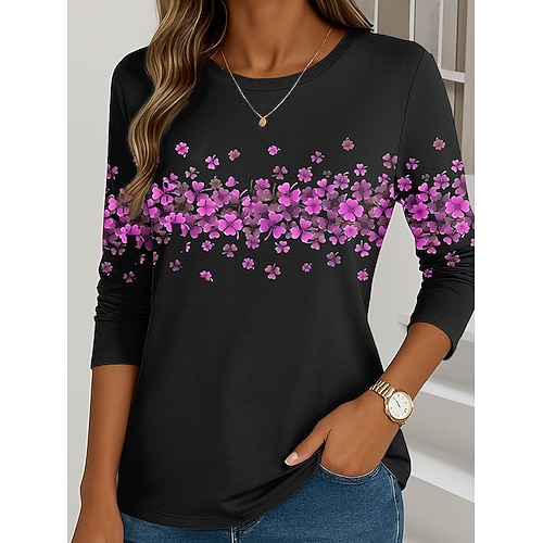 Maglietta donna maniche lunghe tunica girocollo grafica floreale gatto vintage stilosa classica top regolari stampa giornaliera fine settimana rosa blu viola verde primavera autunno