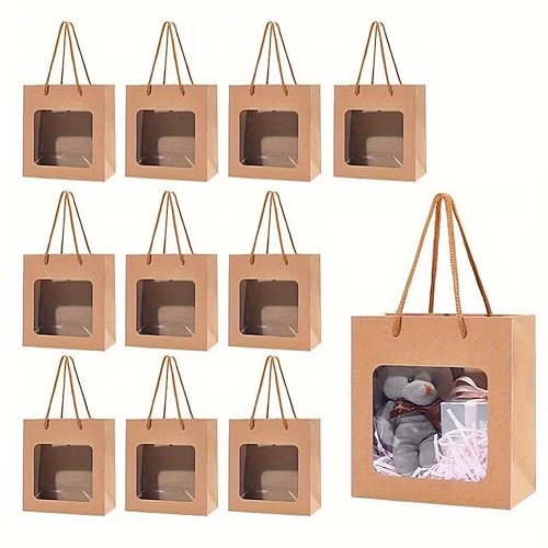 12 Stück Kraftpapier Geschenktüten mit PVC-Fenster und Griffen Perfekt für Geburtstags Hochzeits- Party- und Valentinstagsgeschenkverpackungen