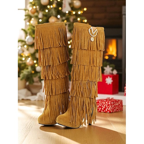 stivaletti da donna color cachi, stivali casual in finta pelle scamosciata con frange di perline per outfit autunnali e quotidiani
