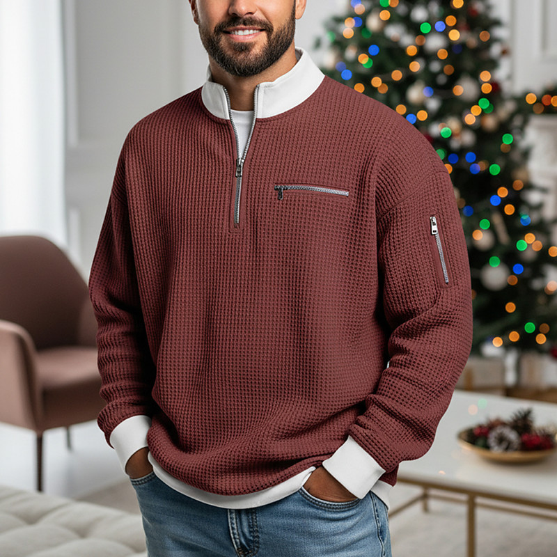 Men's Waffle T-shirt T Shirt Long Sleeve Half Zip Fall Fall Winter Solid Color Traditional / Vintage Casual Color Block Zipper Pocket Outdoor Home Sports Outdoor Light Blue Green Red Top Tee for