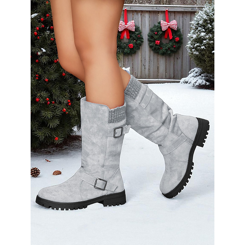 Women's Red Faux Suede Mid-Calf Boots with Adjustable Buckles and Non-Slip Sole, Casual Comfort Knit Boots for Christmas Daily Wear