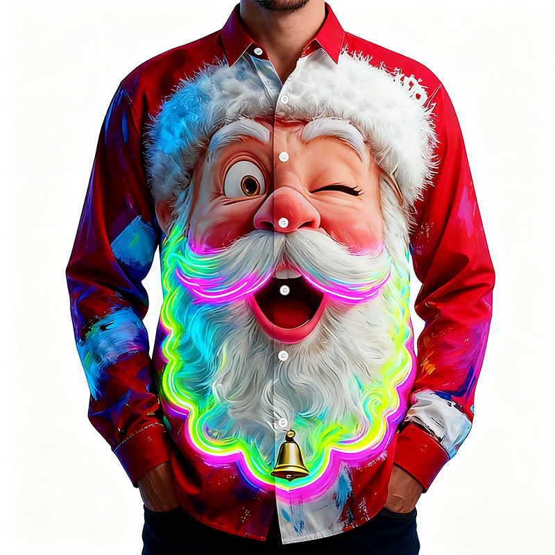 Christmas Men's Santa Claus Smile Face Neon Glow Shirt Button Up Shirt Long Sleeve Funny Outdoor Holiday Spring Fall Turndown 3D Print Collared Shirts Red 1 Red 3 Red Red 2