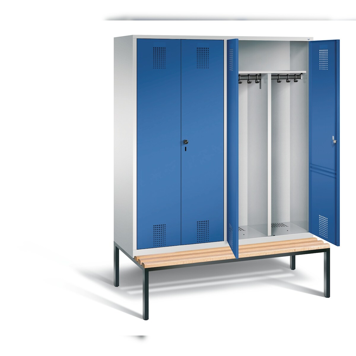 Z-Spind Classic PLUS Sitzbank, 2 Abteile, lichtgrau / lichtblau, B 600 mm, Zylinderschloss, auskragend, Buche-Hartholz C+P
