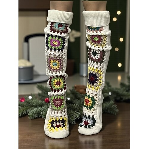 calzini lunghi fino al ginocchio da donna all'uncinetto con motivo granny square a tema natalizio, design lavorato a maglia multicolore per le feste e la moda invernale