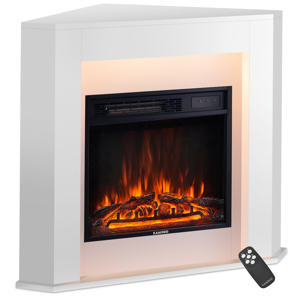 KAMINIO Elektrokamin MATTI - Elektrischer Eckkamin mit Heizung, 3D-Flammeneffekt, LED-Ambientelicht, Fernbedienung - Ecke, Weiß