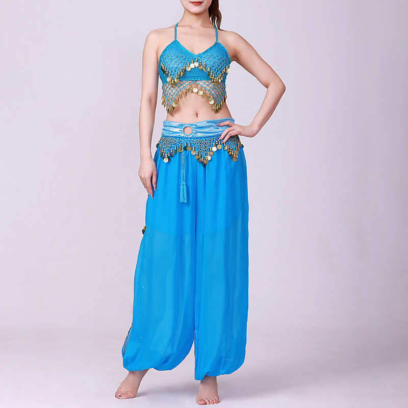 Women's Belly Dance Pants Elastic Wasited Coin Lantern Pants Side Split Sequin Shiny Harem Arabian India Performance Trousers