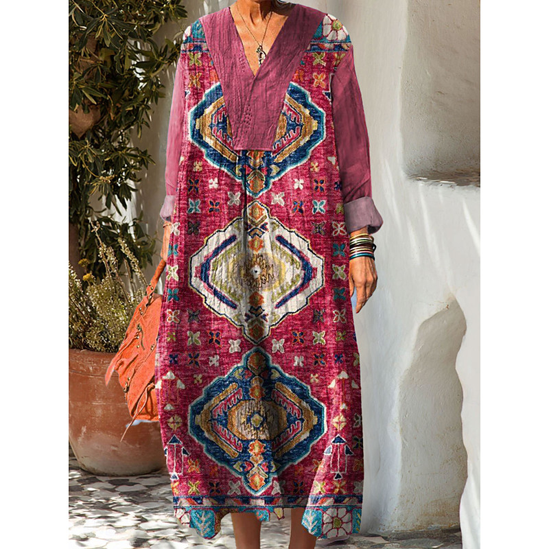 Women's Midi Dress V Neck Long Sleeve Kaftan Lightweight Loose Fit A Line Dress Casual Boho Party Going out Floral Graphic Long Sleeve V Neck Gray Green Pink Purple off-white