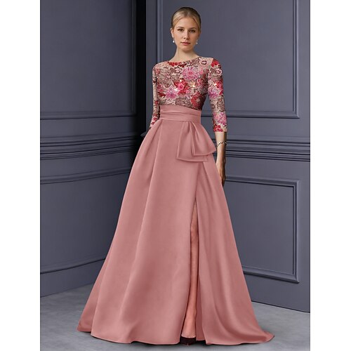 Linea ad A Lunghezza al pavimento Perline ricamate Abito Formale Abito da madre della sposa Abito da Sera Abito formale Elegante Brillanti Spacco Alto Manica 3/4 Girocollo Matrimonio Formale Mantelle