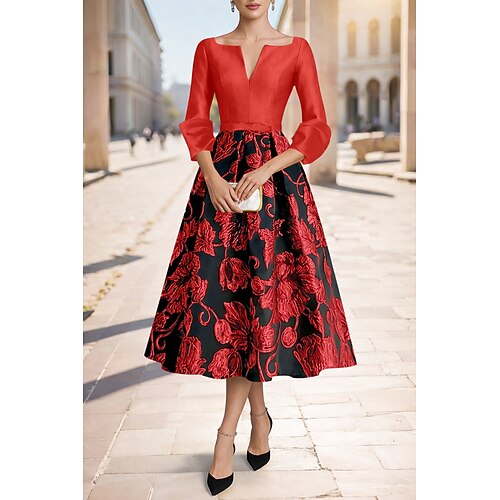 Linea ad A Lunghezza Tè Vestito da Festa Abito da Cocktail Abito da invitata a nozze Abito da cerimonia per signora Manica 3/4 Scollo a V Elegante Minimalista Formale Cocktail party Raso con Stampa