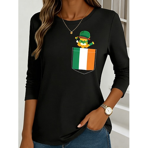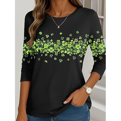 T-Shirt da donna per il giorno di San Patrizio Grafica Quadrifoglio Moda Elegante Classico Maniche Lunghe Girocollo Collo Rotondo Top Regolari Quotidiani Stampa Fine Settimana Nero Bianco Verde