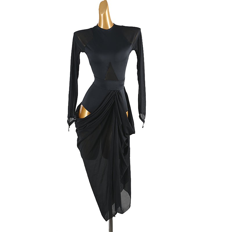 Elegant Black Latin Dance Dress for Women - Long Mesh Sleeves, Mock Neck, Beaded Bodice with Fringe Intricate Accents Rumba Salsa Tango Gown