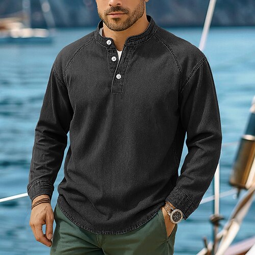 Per uomo Maglia Henley Camicia 100% cotone lavaggio acido Manica Lunga Henley Primavera Autunno Tutte le stagioni Tinta unica Vintage Retrò Vintage Casual Stile Vintage Lavato Casuale Blu chiaro Nero