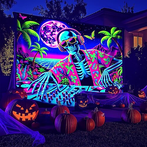 Arazzo Blacklight di Halloween scheletri reattivo ai raggi UV luminescente al buio foresta montagna psichedelica cimitero nebbioso fantasma arazzo appeso arte murale per soggiorno camera da letto