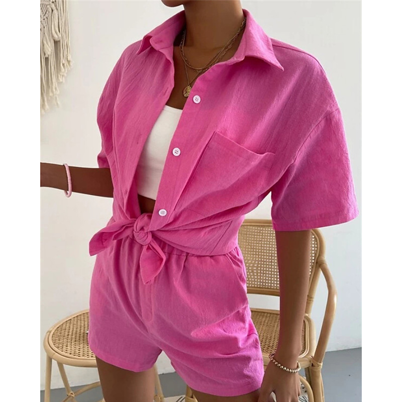 Women's Fashion Streetwear Shirt Linen-Inspired Sets Two Piece Sets Linen Pants Baggy Shorts Long Sleeve Shirt Collar Solid Color Daily Wear Date Blue Purple Orange Summer Regular Fit