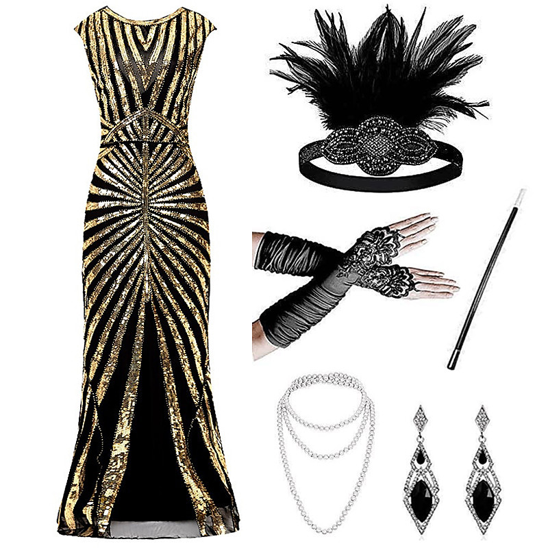 Set Roaring 20s 1920s Cocktail Dress Knee Length Flapper Dress Dress Outfits with Accessories Sleeveless The Great Gatsby Charleston Sequins Tassel Fringe Feather V Neck Fancy Dress Women's Carnival