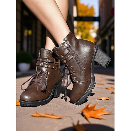 stivaletti da donna con tacco grosso e lacci marroni – stile combat in similpelle con cerniera laterale e fibbia, ideali per outfit autunnali, attività all'aperto e streetwear casual