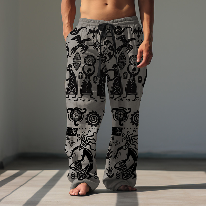 Men's Color Block Graphic Prints Linen Pants Trousers Summer Pants Mid Waist Ethnic Style Retro Vintage Casual Daily Holiday Drawstring Elastic Waist 3D Print Spring Summer 3D Print Black Green