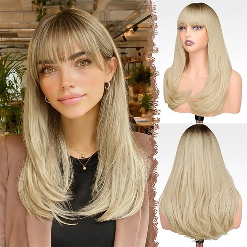 Parrucca lunga con frangia, parrucca sintetica naturale a strati con capelli lisci per uso quotidiano da donna, per feste, 18 pollici, castana