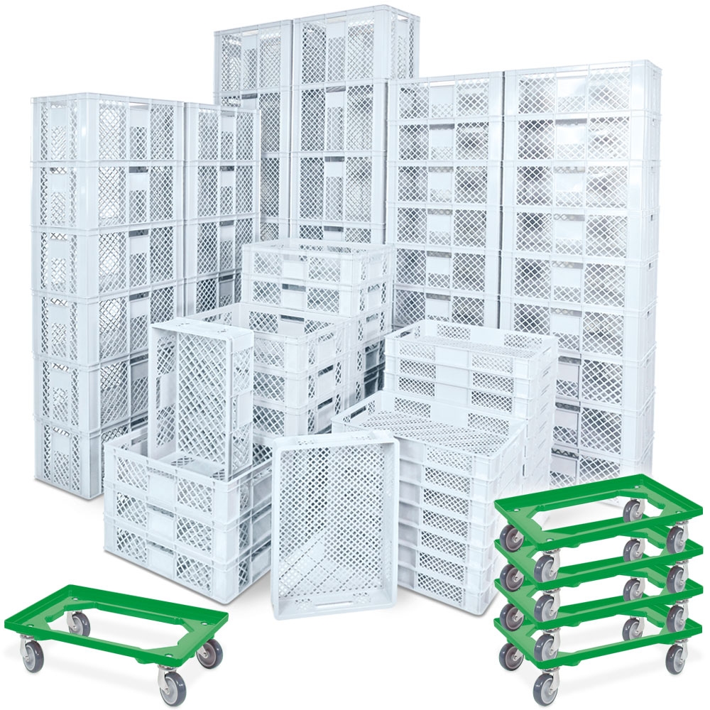 BRB 78 Bäckerkisten in 5 Größen, 600x400 mm, H 90 mm - 410 mm, weiß + 5 Roller, grün