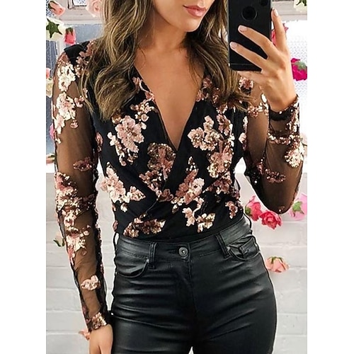 Per donna Camicia Blusa Floreale Essenziale Informale Manica lunga A V Top regolari Da mare Giornaliero Collage Stampa Nero Autunno Inverno