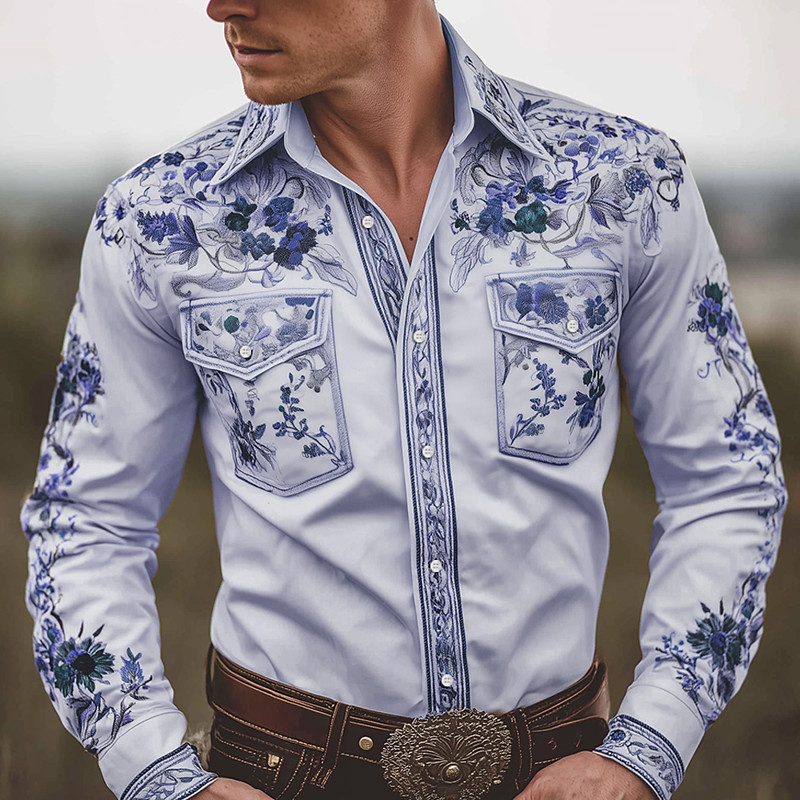 Men's Floral Print Ethnic Flowers Shirt Western Shirt Cowboy Shirt Long Sleeve Vintage Retro Outdoor Casual WorkWear Spring Fall Turndown Front Two Pockets Linen Like Shirt Button Up Shirts Blue