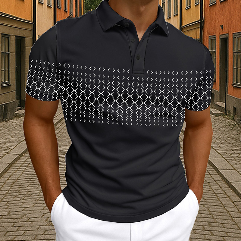 Men's Polo Business Casual Turndown Short Sleeve Geometric Buttons Summer Black White Blue Light Grey Polo