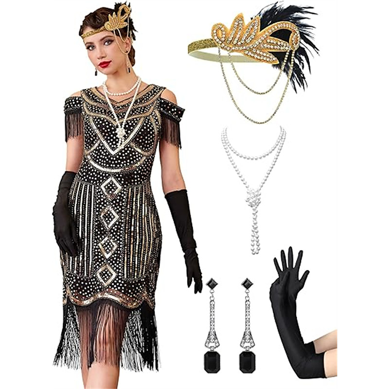 Flapper Dress The Great Gatsby 6 Pcs Retro Vintage Roaring 20s 1920s With Accessories Set Outfits Cocktail Dress Women's Sequins Costume Vintage Cosplay Party Evening Dress