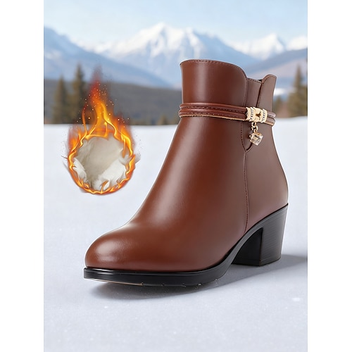 stivaletti marroni da donna con fodera in lana – caldi stivali invernali con tacco in similpelle per il freddo, l'ufficio e gli outfit casual