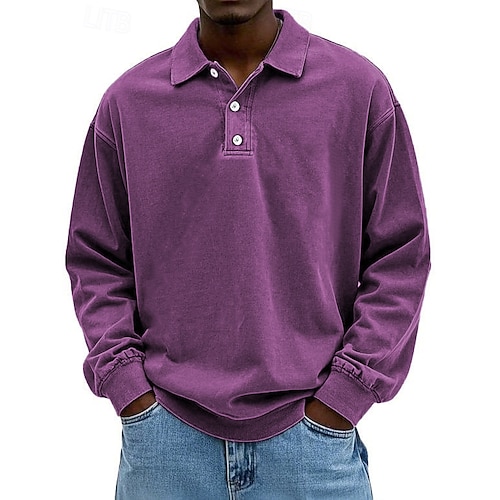 Men's Polo Shirts 100% Cotton Acid Wash Shirt Classic Long Sleeve Casual Sport Activewear Breathable Soft Buckle Acid Wash Vintage Washed Solid Color Blue Black Activewear Cotton Retro Vintage
