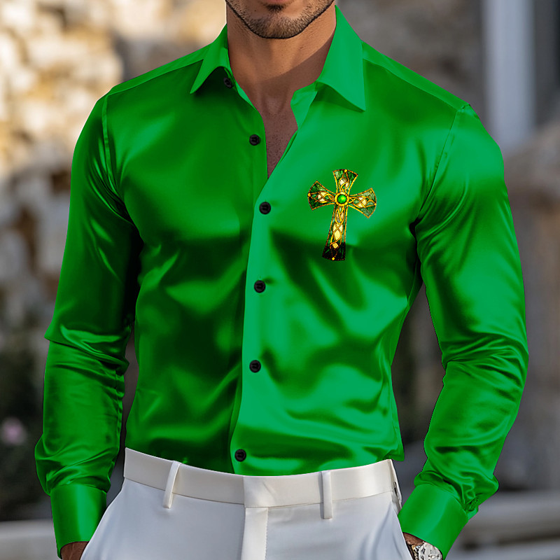 St. Patrick's Day Men's Cross Satin Shirt Dress Shirt Button Up Shirt Long Sleeve Fashion Casual Holiday Summer Spring Turndown Collared Shirts 3D Print Black White Green