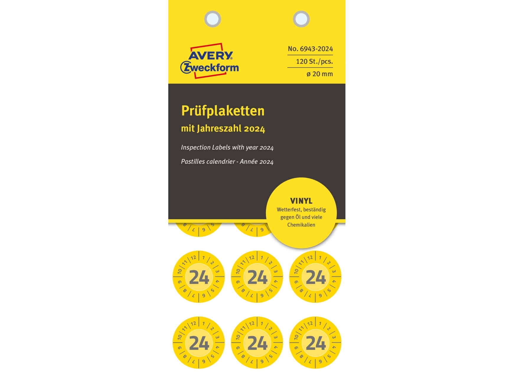 AVERY Avery 6943-2024 Ø 20 mm, 120 Etiketter, Gul Gul 152x70x3,5mm (8stk) - (8 pce pr. blister emballage)