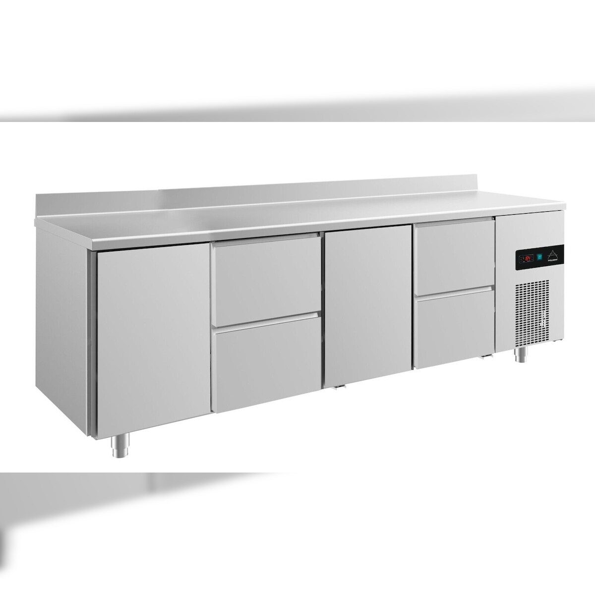 Wimar Gastro Kühltisch 2 Türen links&mittig je 2 Schubladen mittig&rechts Umluftkühlung Aufkantung, 2330x700x850mm -2/+8°C 632l