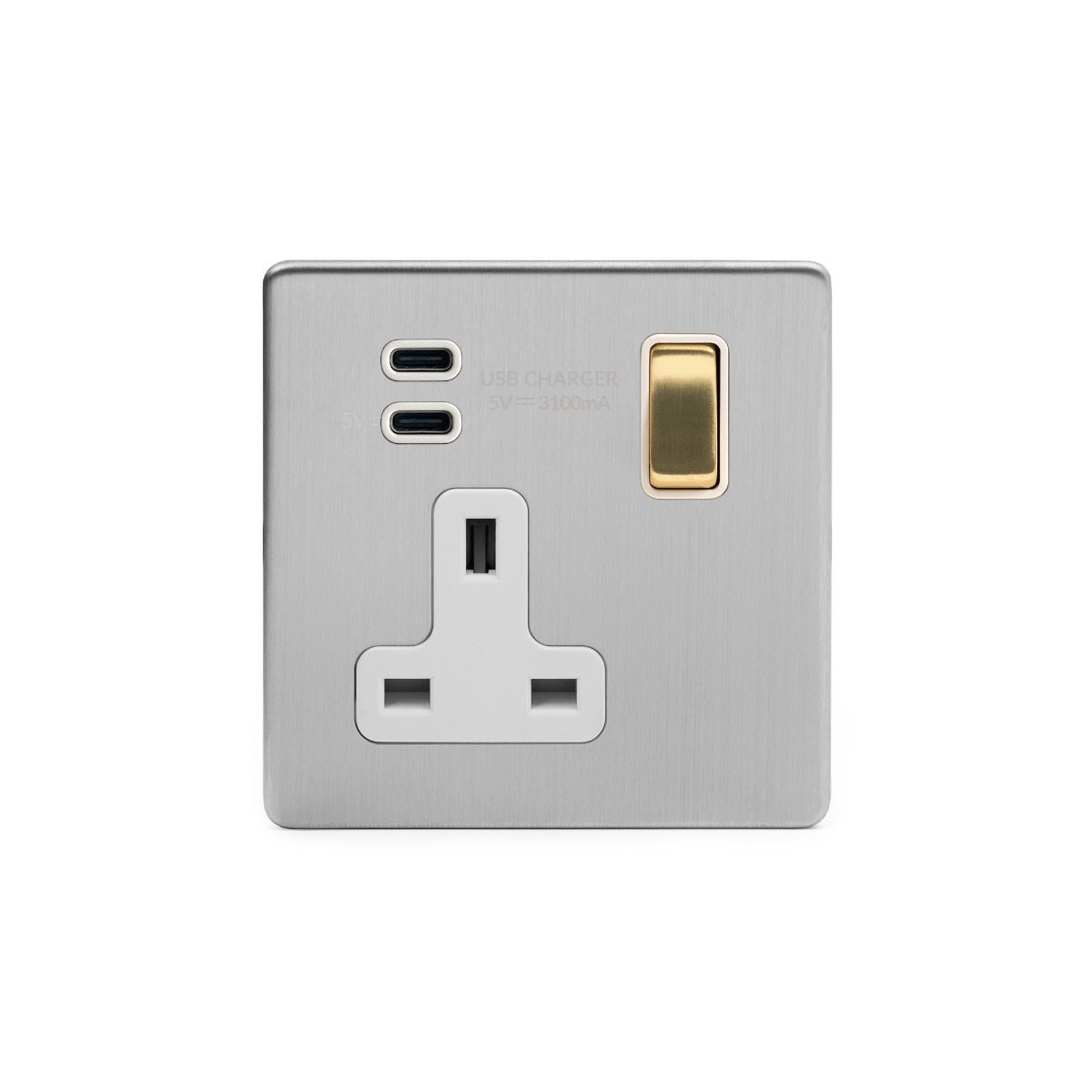 Soho Lighting Brushed Chrome & Brushed Brass 1 Gang USB C+C Socket (13A Socket + 2 USB C 3.1A Ports) White Inserts