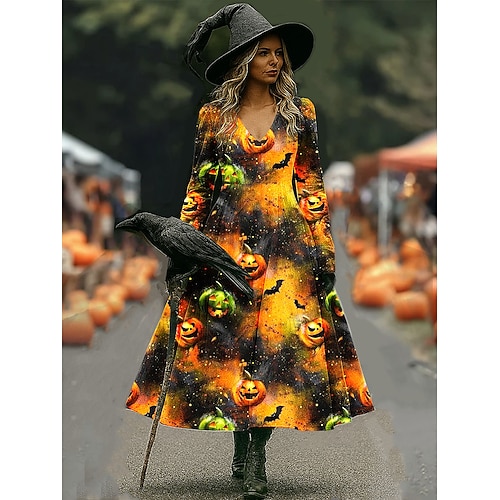 Abito midi Halloween da donna con stampa strega abito modello ad A vacanza casual matrimonio festa compleanno vestibilità regolare grafica floreale rosa maniche 3/4 collo a V giallo rosa blu