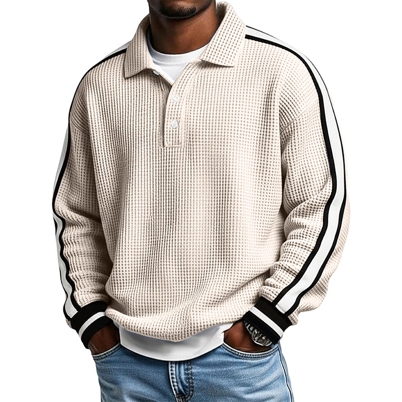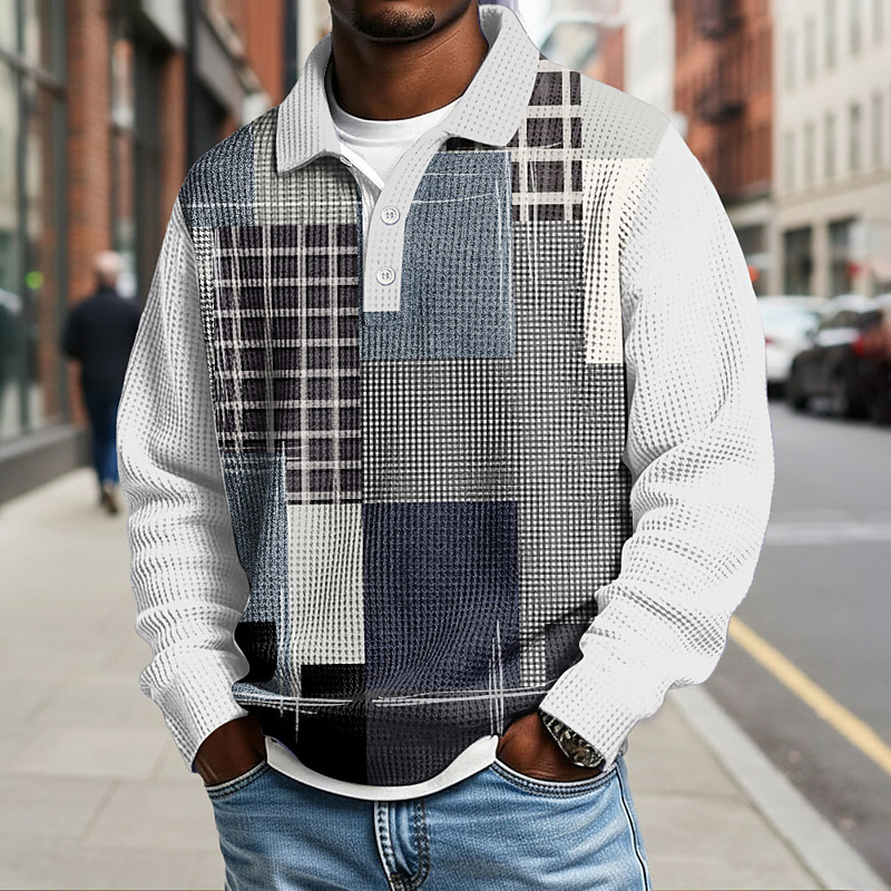 Men's Geometic Line Waffle Polo Shirts Long Sleeve Polo Shirts Collared Shirts Casual Daily Wear Buttons Spring Fall Winter White Blue Light Grey