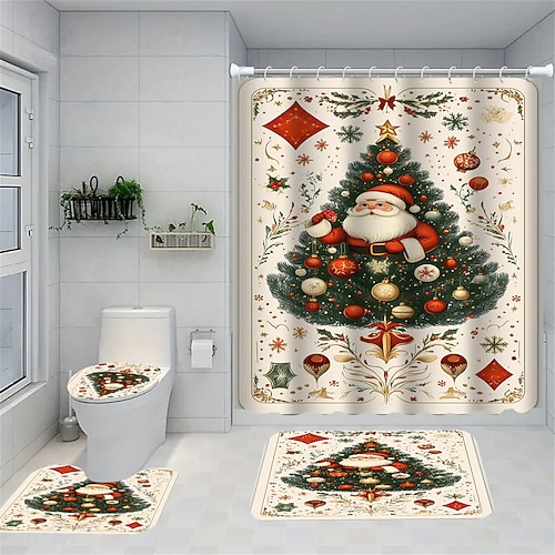 combinazione di tende da doccia in quattro pezzi, tra cui un robusto sedile del water antiscivolo e un tappetino da bagno – materiale in poliestere impermeabile con motivo ad albero di Natale e 12