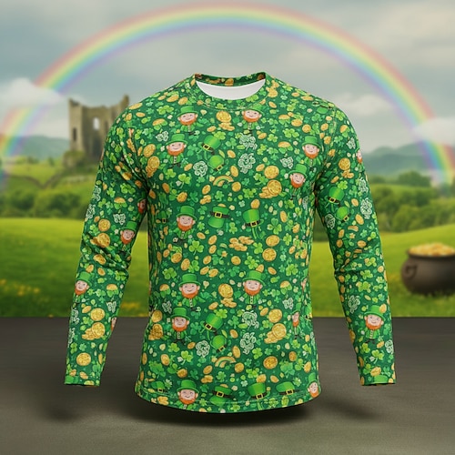 T-shirt a maniche lunghe per uomo per il giorno di San Patrizio, maglietta grafica con trifoglio irlandese fortunato, scollo rotondo con stampa 3D, top per il giorno di San Patrizio