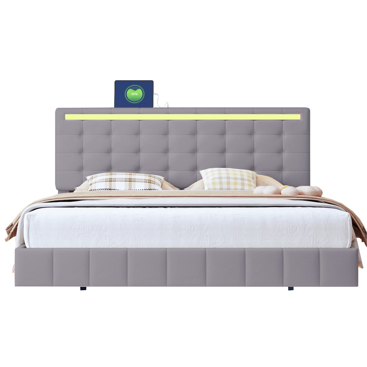 Merax Polsterbett 160 x 200 cm, gepolsterter Schwebebettrahmen mit LED-Leuchten, Doppelbett, Gästebett, Leinen, Grau