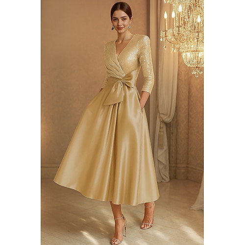 Linea ad A Lunghezza Tè Abiti da Cocktail Abiti da festa Elegante Manica 3/4 Scollo a V Festa in giardino Matrimonio Raso Elasticizzato Con Paillettes con Fiocco/Fiocchi