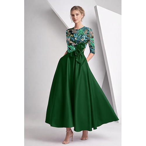 Linea ad A Lunghezza alla caviglia Perline ricamate Abito Formale Abito da madre della sposa Abiti da Cocktail Elegante Scintillante Floreale Manica 3/4 Scollo Illusione Matrimonio Formale Tasca Raso