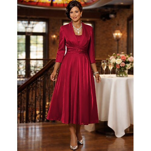 Linea ad A Lunghezza Tè Abito da invitata a nozze Abito da cerimonia per signora Manica 3/4 Collo quadrato Elegante Vintage Taglie Forti Ospite di nozze Abiti con Giacca con Arricciatura