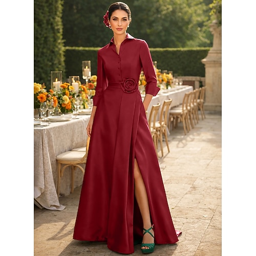 Linea ad A Lunghezza al pavimento Abito Camicia Abito da invitata a nozze Abito Formale Abito da cerimonia per signora Manica 3/4 Colletto a Camicia Elegante Matrimonio Formale Taffetà Raso