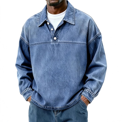 Per uomo Maglietta Maglia Henley Camicia di Jeans Camicia 100% cotone lavaggio acido Manica Lunga Semplice Vintage Streetwear Casual Lavato Manica corta Collo alla coreana Henley Casuale Streetwear