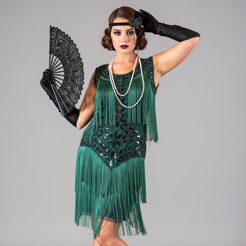 Set with Flapper Dress Feather Headband Long Opera Gloves Necklace Earings Cigarette Holder Women's Roaring 20s 1920s Flapper Girl Cocktail Masquerade Outfits The Great Gatsby Costume