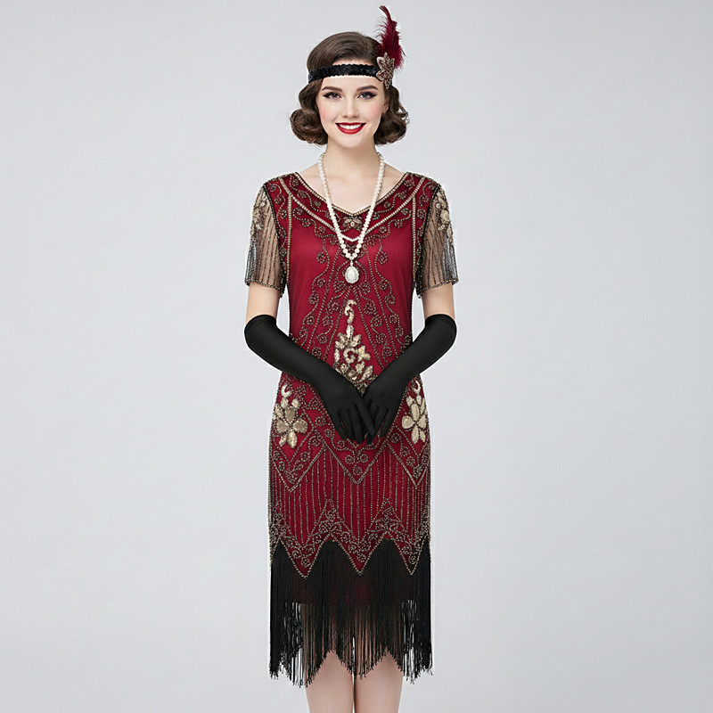 Retro Vintage Roaring 20s 1920s Knee Length Flapper Dress Outfits Accessories Set Short Sleeves The Great Gatsby Wedding Guest Sequins Tassel Fringe Sequin Tassel V Neck Fancy Dress Women's Carnival