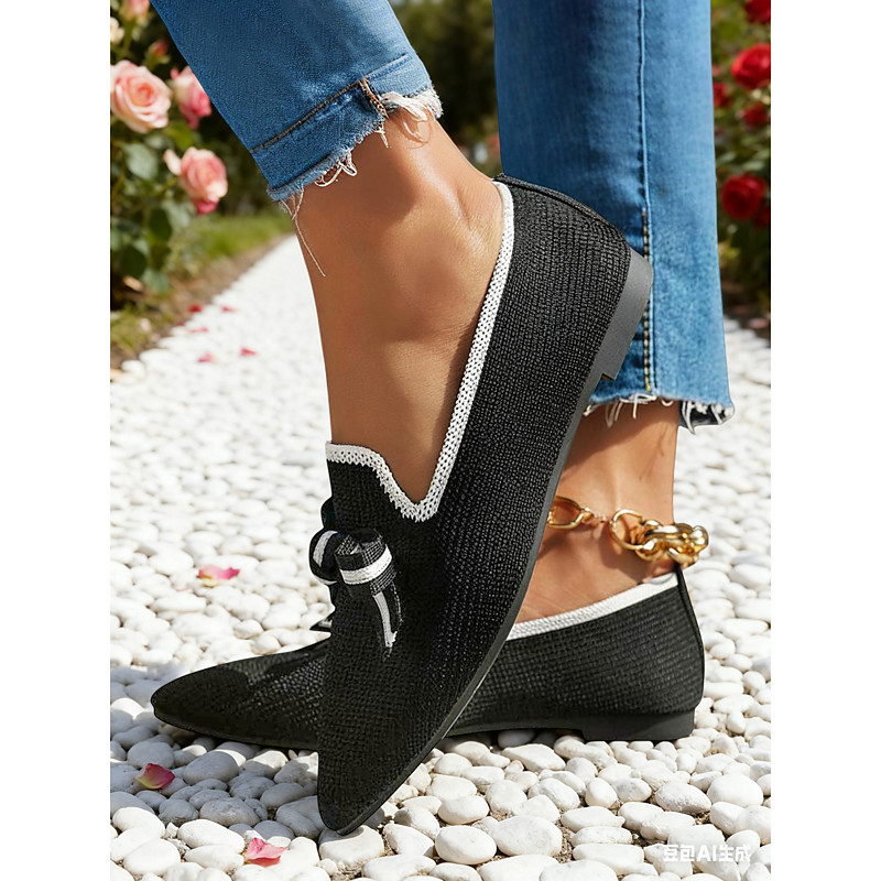 Women's Beige Knit Pointed Toe Loafers with Bow Knot – Elegant Breathable Slip-On Flat Shoes for Business Casual, Brunch Travel