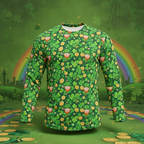 T-shirt a maniche lunghe per uomo per il giorno di San Patrizio, maglietta grafica con trifoglio irlandese fortunato, scollo rotondo con stampa 3D, top per il giorno di San Patrizio