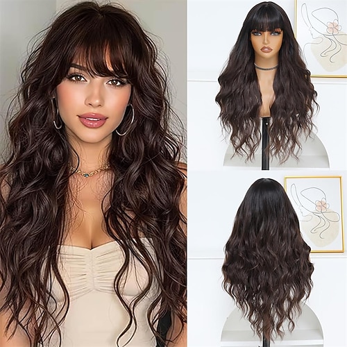 Dunkelbraune Damenperücke, lange, braune, gewellte Perücke mit Pony, 66 cm (26 Zoll), natürlich aussehende, hitzebeständige Kunsthaarperücke für den täglichen Gebrauch und Partys