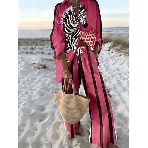 Per donna Moda Streetwear Camicia Set di biancheria in cotone Set da due pezzi Pantaloni di Lino Pantaloni Manica Lunga Colletto a Camicia Blocco di colori Patchwork Abbigliamento quotidiano Data